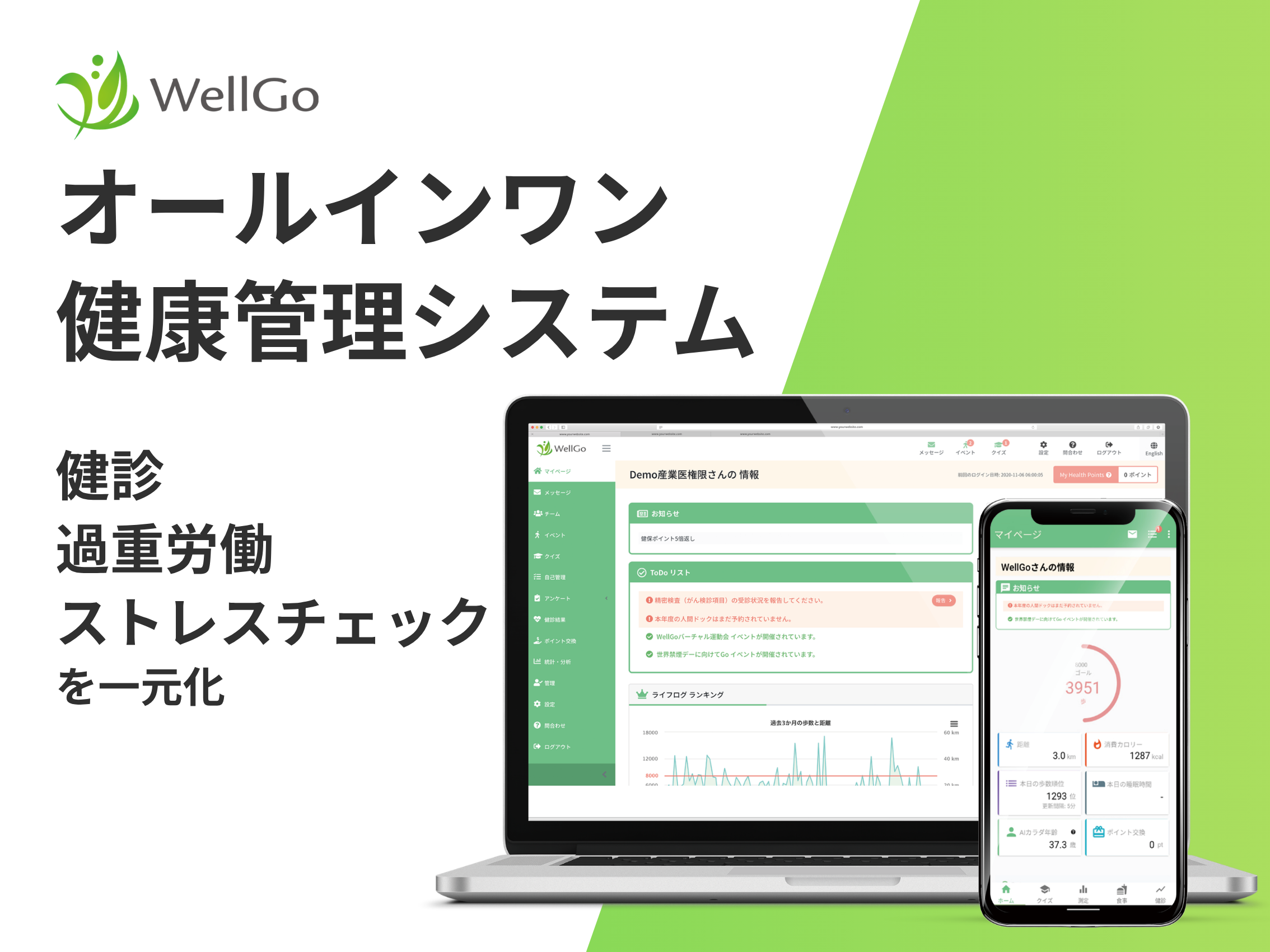 健康情報の一元管理による業務効率化から、健康課題の解決による健康経営推進までのトータルソリューション!プレゼンティーイズムの取得やエンゲージメント・パルスサーベイも対応。健康アプリは、累計1,200万ダウンロード突破の法人版サービスです。