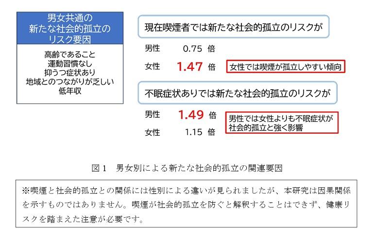 喫煙習慣については、「男性は現在喫煙している者の方が孤立しない」「女性は現在喫煙している者の方が孤立しやすい」という傾向がみられたが、研究チームは「男性は喫煙すると孤立しない」「女性は喫煙すると孤立する」という因果関係を意味するものではない、と強調。