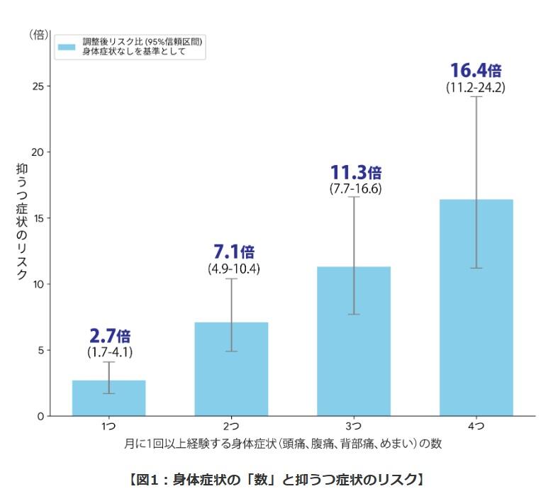 その結果、頭痛・腹痛・背部痛・めまいの4症状のうち、月に1回以上経験する症状が1つある子どもは、症状がない子どもに比べて2.7倍抑うつ症状のリスクが高いことが明らかになった。