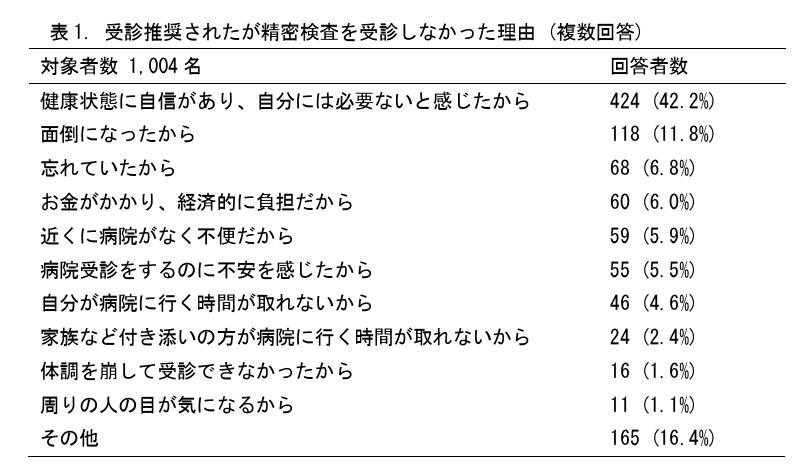 また、自由記述では、「検査結果を見ていない」「受診を勧められた記憶がない」といった声もあったことから、「今後は、検査結果の画面表示や郵送など本人の自覚や意思だけに頼るのではなく、医師会、地域のかかりつけ医と連携し、顔の見える関係を築いて丁寧に周知、支援を行うことが重要」だと強調した。