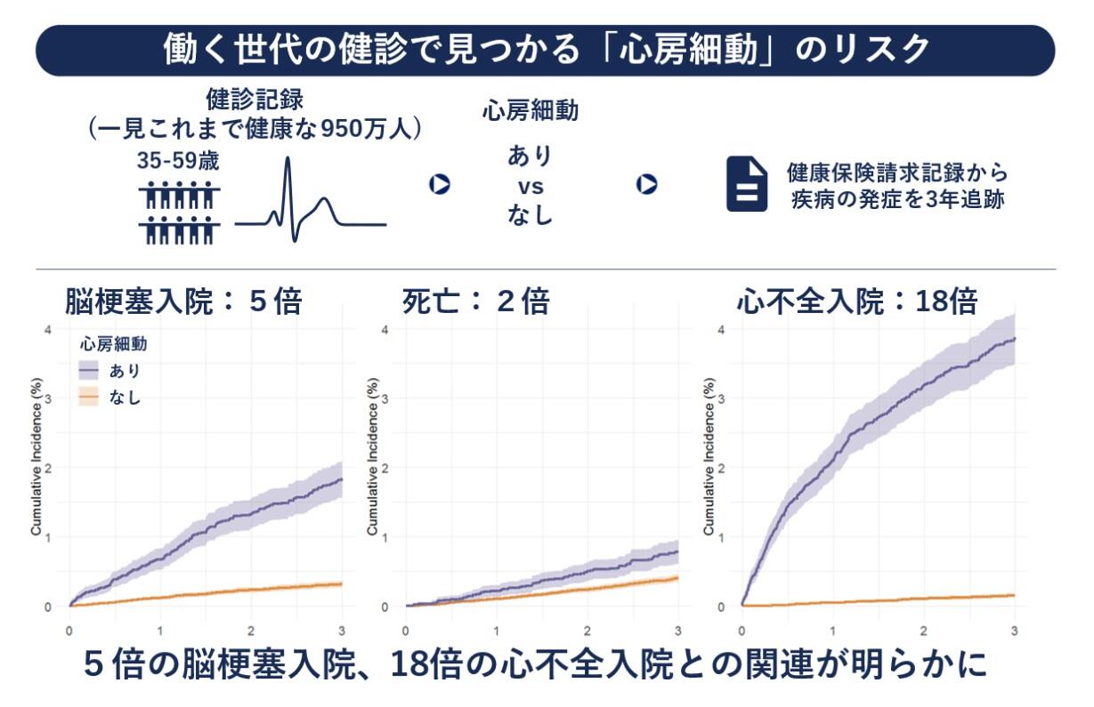 京都大学と広島大学の研究チームは、働く世代(35~59歳)の健診で偶然発見される心房細動が、将来的な脳梗塞および心不全の発症リスクと強力に関連することを明らかにした。