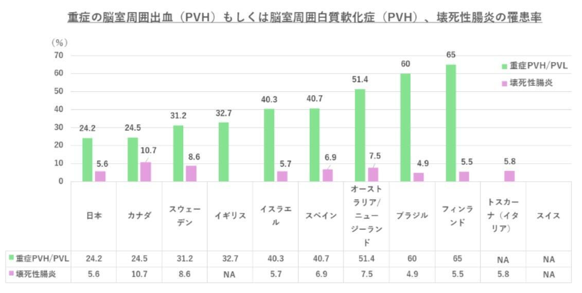 一方、重症の脳室周囲出血(PVH)または脳室周囲白質軟化症(PVL)の罹患率について各国の状況を比較した結果、国によって妊娠22週では24~65%、妊娠23週では18~56%と格差が大きかった。また妊娠23週で生まれた場合の壊死性腸炎も同様で、6~28%と差が見られた。日本は重症PVH/PVL、壊死性腸炎の割合が低い。