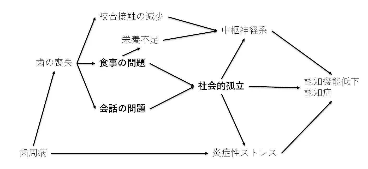 従来、口腔機能と認知症の関連は示唆されてきたが、本総説は因果推論の枠組みを用い、そのメカニズムを整理した点に新規性がある。具体的には、口腔機能低下がコミュニケーション(会話)や共食(食事)の機会を奪い、社会的孤立を深めることで、認知機能低下を加速させるというパスを提示している。