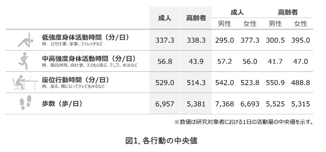 これまでは身体活動量に関する全国規模かつ代表性のある客観的データが十分ではなく、日本人がどれぐらいの時間、身体を動かしているのか、または座っているのかを明確に把握できていなかった。今回の調査結果から男女や成人、高齢者ごとの身体活動の特徴が見えてきた。