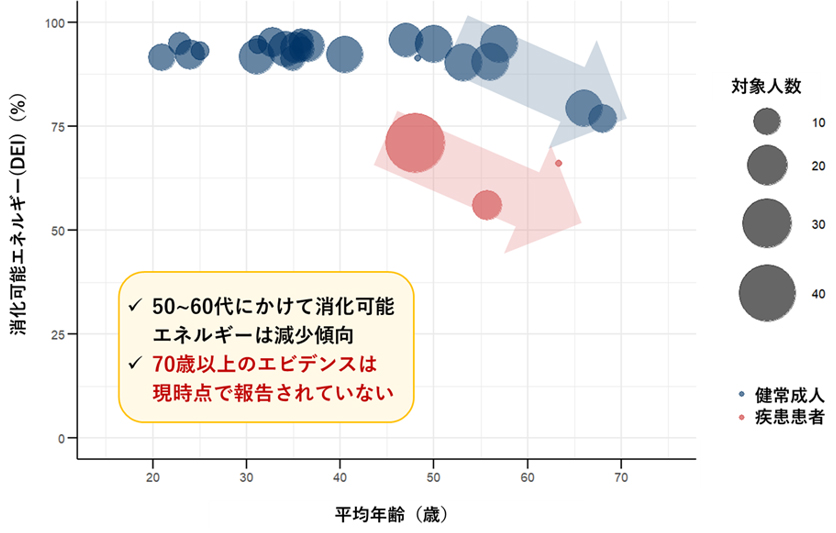 特に、在宅静脈栄養を受けている腸管不全患者では、エネルギー吸収率が著しく低下していた。一方で、70歳以上の高齢者や消化管疾患以外の慢性疾患を対象とした研究は限られており、エビデンスの蓄積が求められる。