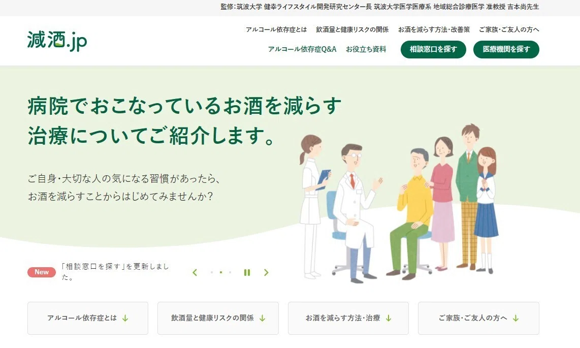 飲酒によるリスクやアルコール依存症に関する情報を提供するサイトです。「お酒をやめる」だけではなく、「お酒を減らす」という治療法についてもご紹介しています。説明用スライドや動画の無料ダウンロード、ご家族や周囲の方が気軽に相談できる電話相談窓口や医療機関の検索が可能です。