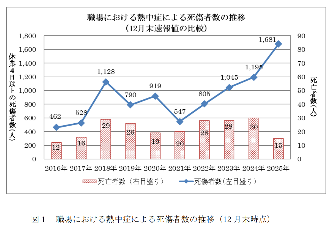 しかし、2025年の速報値では、職場での熱中症による休業4日以上の死傷者数は1,681人、うち死亡者数は15人(いずれも全産業計)に上った。死亡者数は前年から減少したものの、死傷者数は前年比約1.4倍(460人増、速報値ベース)で大幅に増加している。