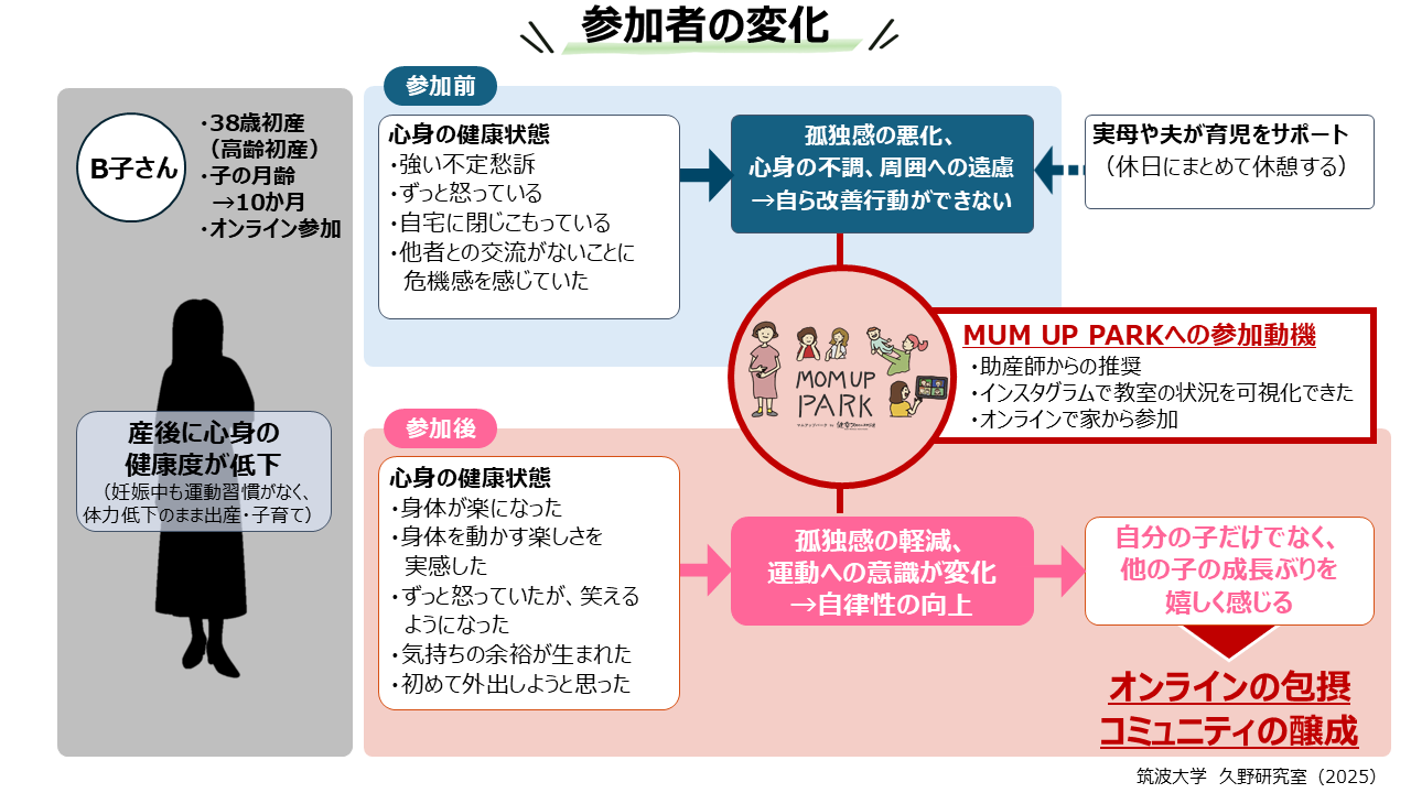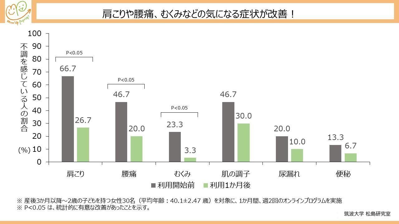 「マムアップパーク」への参加で、心身の改善(肩こりや腰痛などの不定愁訴)と質的な改善(他の子の成長を嬉しく感じる寛容性など)が認められることが明らかになっています。