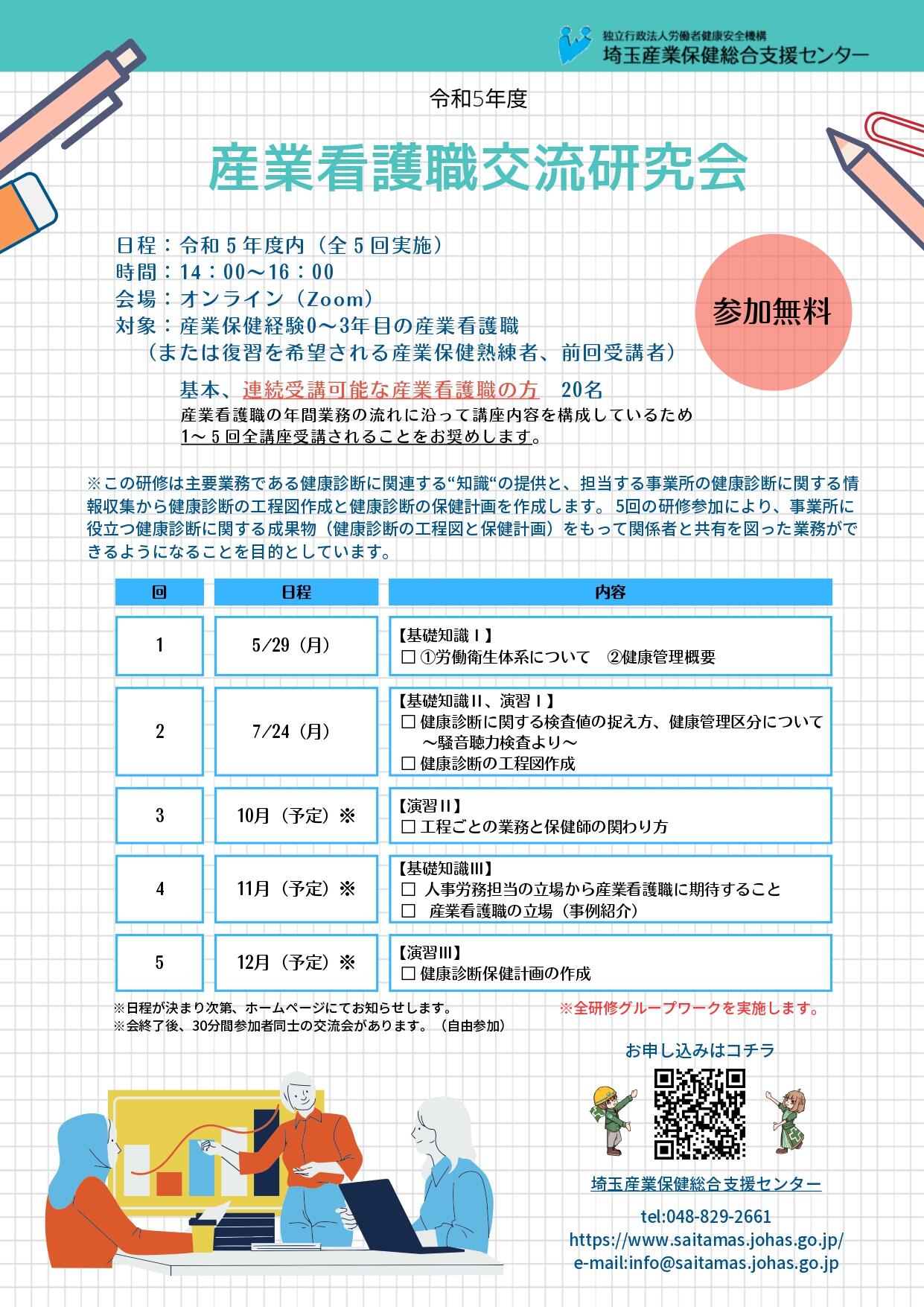 独立行政法人労働者健康安全機構 埼玉産業保健総合支援センターでは「産業看護職交流研究会」を開催している。本研修は、産業保健の業務経験が3年未満の産業看護職を主な対象にしており、年間を通して全5回のプログラムを実施する。