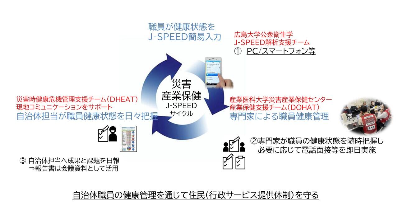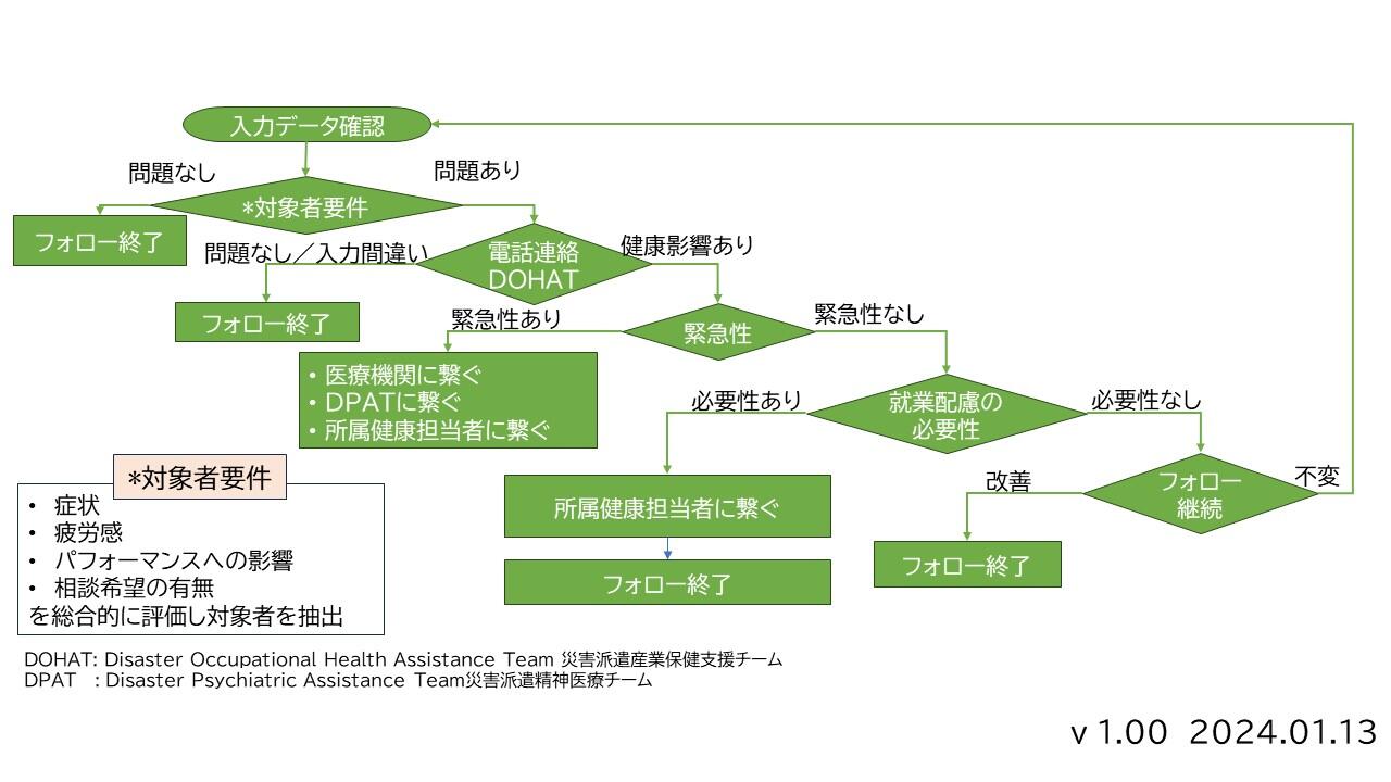 石川県保健医療福祉調整本部内で行政職員健康管理版 J-SPEED[3]というシステムを用いて活動中の健康管理支援は提供されました。入力データに基づき、問い合わせや内服薬の補給、疲労度チェックなどのフォローアップを産業保健の専門家が行い、緊急対応が必要な場合はDPAT(Disaster Psychiatric Assistance Team:災害派遣精神医療チーム)につなぎました。