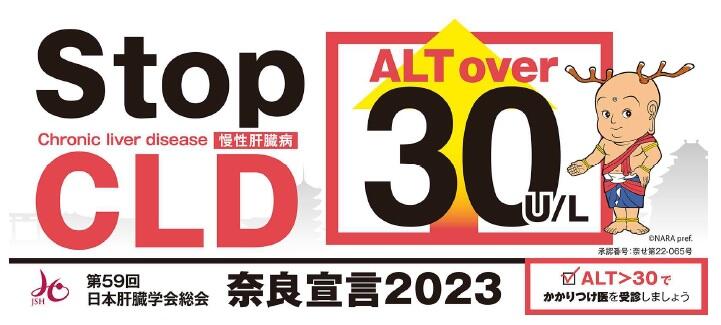 吉治「奈良宣言2023」は2023年6月、奈良市内で開催した第59回日本肝臓学会総会で発表しました。健康診断の血液検査で肝機能の指標として広く測定されているALTの値に注目し、「Stop CLD ALT over 30U/L」、すなわち慢性肝臓病撲滅のため「ALT>30でかかりつけ医の受診を」と呼びかけたものです。明確な数値で受診の目安を示すのは今回が初めてとなります。